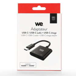 [SANS CONCESSIONS] Grce à l’adaptateur WE, ne faites pas de concessions ! Continuez à écouter votre musique, regarder votre film ou bien terminez sans inquiétudes votre appel tout en chargeant votre smartphone.[LARGE COMPATIBILITÉ] L’adaptateur WE est conçu spécialement pour les appareils disposants d’un port USB C sans port jack 3,5mm. Il est compatible avec tous les derniers modèles de marque Huawei™, Xiaomi™, Samsung™, etc. (liste non exhaustive)[AUDIO HAUTE FIDÉLITÉ] Équipé d’une puce DAC, l’adaptateur WE offre une technologie de suppression du bruit vous permettant d’écouter votre musique avec une restitution maximale pour un son clair et sans pertes.[SIMPLICITÉ ET LÉGÈRETÉ] Avec son design compact et épuré, l’adaptateur WE va devenir un prolongement naturel de votre smartphone. Sa simplicité d’utilisation en fera un allié de choix chez vous ou à l’extérieur.[CONTENU DU PACKAGING] 1x adaptateur 2 en 1 USB C vers 2x USB-C audio et charge 3,5mm ainsi qu'une garantie de 1 an et un service client situé en France pour répondre à la moindre demande.