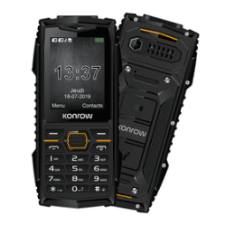 Ecran 2.4" QVGA Réseau 2G Double Sim Mémoire Interne de 32 Mo Mémoire RAM de 32 Mo Appareil Photo VGA Bluetooth Stéréo IP68 étanche à 1,5m pour 30 Min Radio FM Lampe torche 3 Leds intégrée Batterie Li-ion 4.2V /1700 mAh Autonomie en Veille jusqu'à 566 h